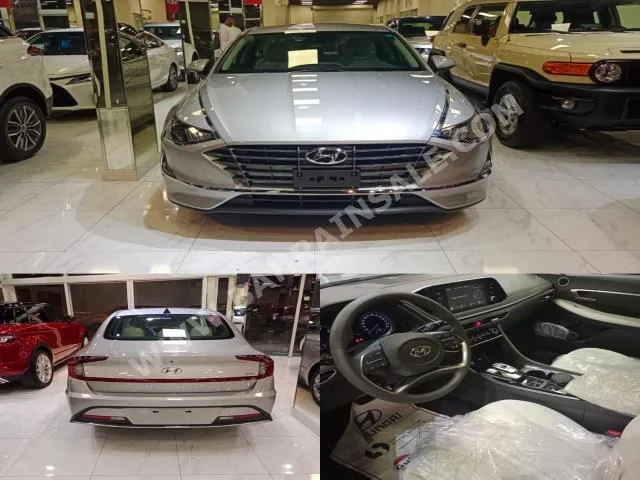 {A 2023 Hyundai Sonata Standard sedan in silver with beige cloth interior, 0 KM, FWD, automatic transmission, 4-cylinder gasoline engine, equipped with camera, sensors, Bluetooth, and under warranty, is for sale in Kuwait; it has no GPS, CD, DVD, or slide roof.}
