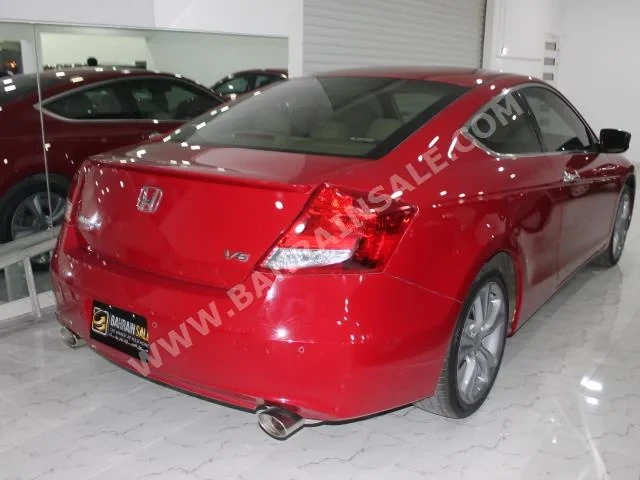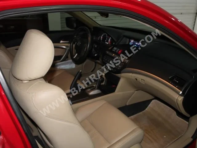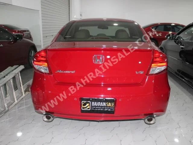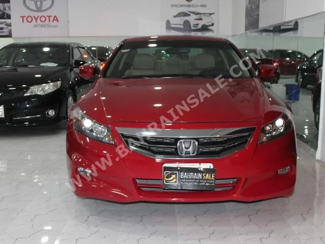 Honda Accord Standard 2012 Coupe/Sport Automatic, 4-cylinder, 72,000 KM, FWD, finished in Red with Beige leather interior, no GPS, with CD, no DVD, no camera, equipped with sensors, slide roof, gasoline, no warranty, Bluetooth, imported from dealer, and available for sale.