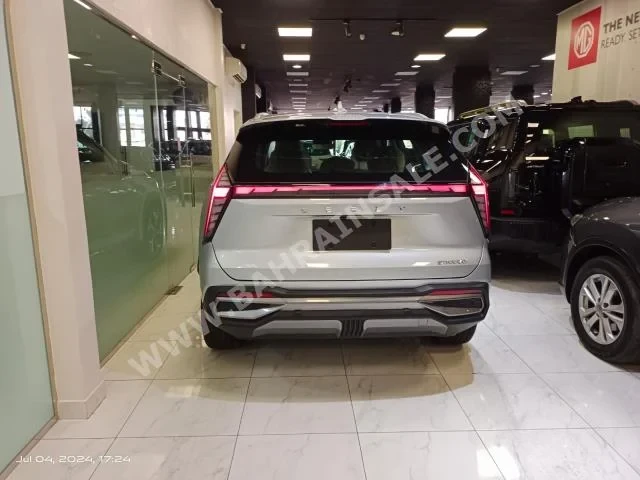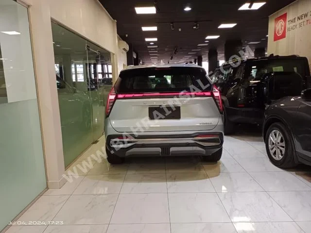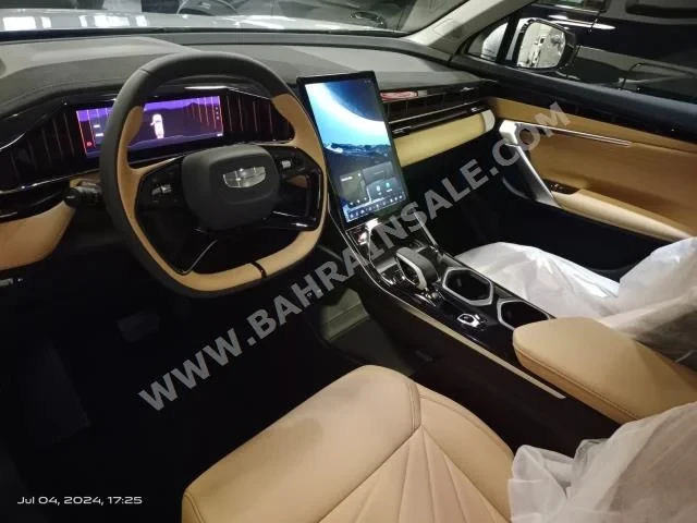 A 2025 Geely Emgrand X7 Sport SUV, silver with a beige leather interior, 0 KM mileage, FWD automatic transmission, 4-cylinder gasoline engine, equipped with GPS, camera, sensors, Bluetooth, a panorama slide roof, and warranty, imported from Kuwait, is offered for sale.