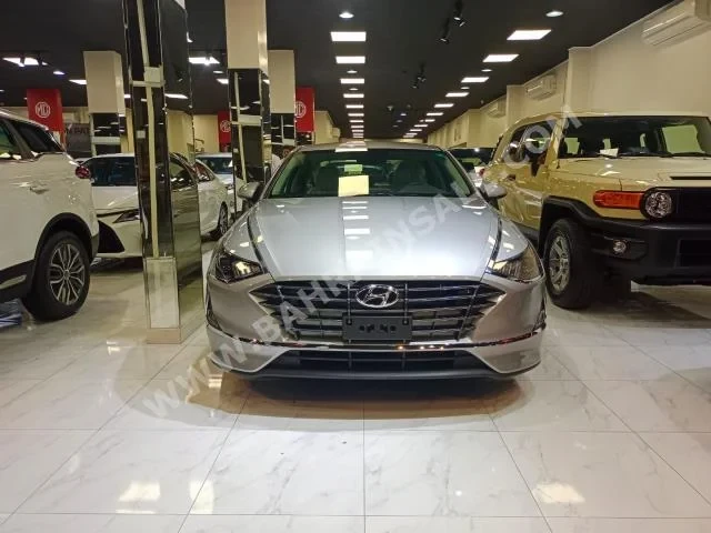 A 2023 Hyundai Sonata Standard sedan in silver with beige cloth interior, 0 KM, FWD, automatic transmission, 4-cylinder gasoline engine, equipped with camera, sensors, Bluetooth, and under warranty, is for sale in Kuwait; it has no GPS, CD, DVD, or slide roof.