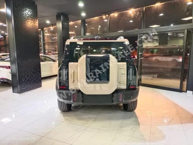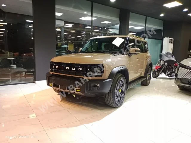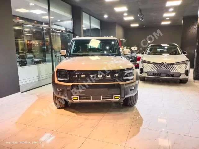 A 2025 JETOUR T2 Luxury SUV in beige with brown leather interior, 0 KM, AWD, automatic transmission, 4-cylinder gasoline engine, equipped with GPS, camera, sensors, Bluetooth, and a panoramic sunroof, under warranty, is for sale in Kuwait; it does not have a CD or DVD player.