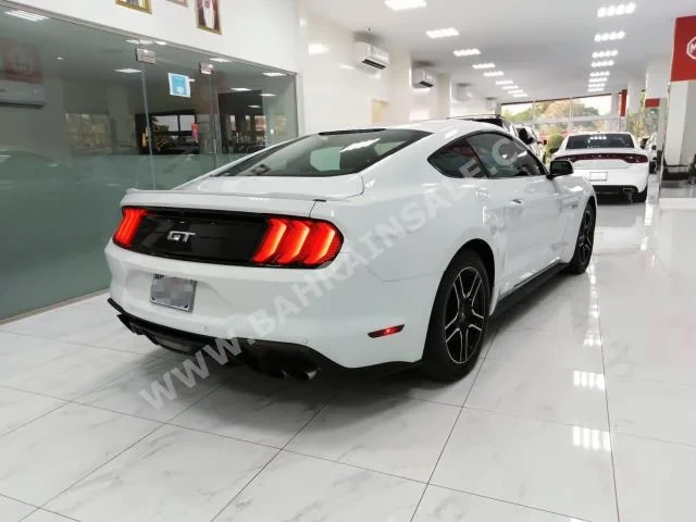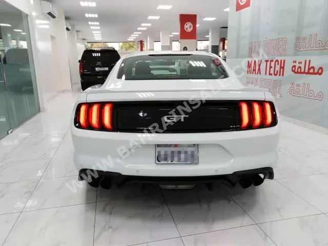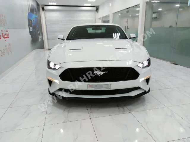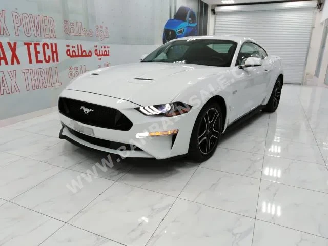 A 2018 Ford Mustang GT coupe/sport in pearl with a black leather/cloth interior, only 19 KM mileage, manual RWD, 8-cylinder gasoline engine, camera, sensors, Bluetooth, imported from the USA, is for sale.